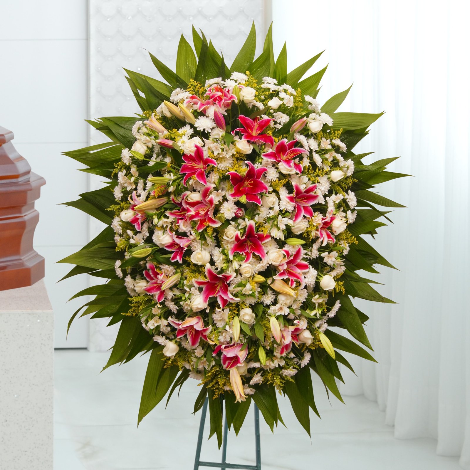 A excepcional Coroa Esmeralda é um arranjo com calábria, aster mariana, tango, rosas, lírios, alstroemerias e gypsophilas, com possibilidade de personalizar com antúrios ou gérberas. Esta coroa de flores em Curitiba é para quem merece o melhor.